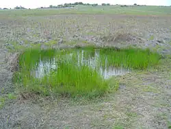 A vernal pool is a shallow depression in the soil which fills up with water during spring rains. Fairy shrimp and other minute crustaceans hatch during this time and lay eggs. These eggs remain dormant during the dry months until the next rainy season allows them to hatch. (6)