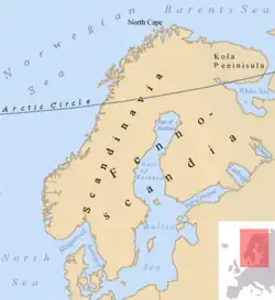 - ↑ (Swedish: Skandinaviska halvön; Norwegian: Den skandinaviske halvøy (Bokmål) or Den skandinaviske halvøya (Nynorsk); Finnish: Skandinavian niemimaa)