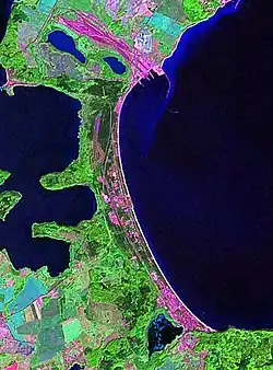 The Schmale Heide (literally "Narrow Heath") is a 9.5-kilometre-long and roughly 2-kilometre-wide bar between the Baltic seaside resort of Binz and the village of Neu Mukran near Sassnitz on the German island of Rügen. It lies in the municipality of Binz and is bounded to the northwest by the lagoon of the Kleiner Jasmunder Bodden and to the east by the bay of Prorer Wiek.