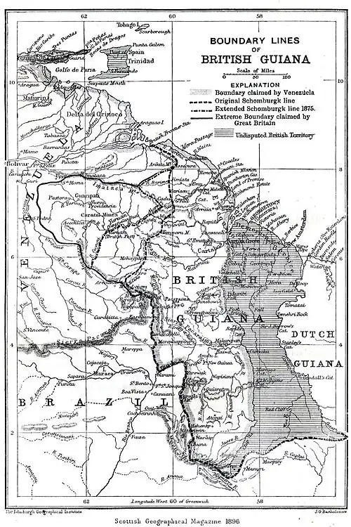 In October 1886 Britain declared the Line to be the provisional frontier of British Guiana, and in February 1887 Venezuela severed diplomatic relations.[1] Venezuela appealed to the United States to intervene, citing the Monroe Doctrine as justification. The United States expressed concern but did little in the way of resolving the situation, until Venezuela's hiring of William L. Scruggs as a lobbyist in Washington, D.C. brought the dispute to a head in the shape of the Venezuelan crisis of 1895. The key issue in the crisis became Britain's refusal to include in the proposed international arbitration the territory east of the Schomburgk Line. The crisis ultimately saw Britain accept the United States' intervention in the dispute to force arbitration of the entire disputed territory, and tacitly accept the United States' right to intervene under the Monroe Doctrine. An international arbitration panel resolved the dispute in 1899. The Schomburgk Line was, with small deviations, re-established as the border between British Guiana and Venezuela.[1] The first deviation from the Schomburgk line was that Venezuela's territory included Barima Point at the mouth of the Orinoco, giving it undisputed control of the river, and thus the ability to levy duties on Venezuelan commerce. The second was drawing the border at the Wenamu River rather than the Cuyuni River, giving Venezuela a substantial territory east of the line – territory which Britain had originally refused to include in the arbitration. However, Britain received most of the disputed territory, and all of the gold mines.[3]