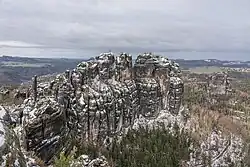 The Schrammsteine are a long, strung-out, very jagged group of rocks in the Elbe Sandstone Mountains located east of Bad Schandau in Saxon Switzerland in eastern Germany. To the north they are bordered by the Kirnitzsch valley, to the south by the Elbe valley and to the east by the Affensteine rocks. The high point of the chain lies at over 400 m above sea level (HN). The viewing point on the Schrammsteine lies at a height of 417.2 m above HN.[1]