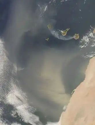 Wind-blown very fine-grained dust is capable of entering the upper atmosphere and moving across the globe. Dust from the Sahara deposits on the Canary Islands and islands in the Caribbean,[3] and dust from the Gobi Desert has deposited on the western United States.[4] This sediment is important to the soil budget and ecology of several islands.