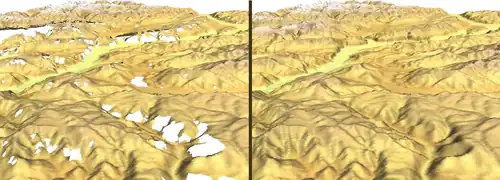 The elevation datasets are affected by mountain and desert no-data areas. These amount to no more than 0.2% of the total area surveyed,[11] but can be a problem in areas of very high relief. They affect all summits over 8,000 meters, most summits over 7,000 meters, many Alpine and similar summits and ridges, and many gorges and canyons. There are some SRTM data sources which have filled these data voids, but some of these have used only interpolation from surrounding data, and may therefore be very inaccurate. If the voids are large, or completely cover summit or ridge areas, no interpolation algorithms will give satisfactory results.