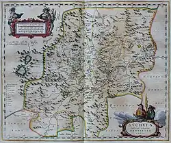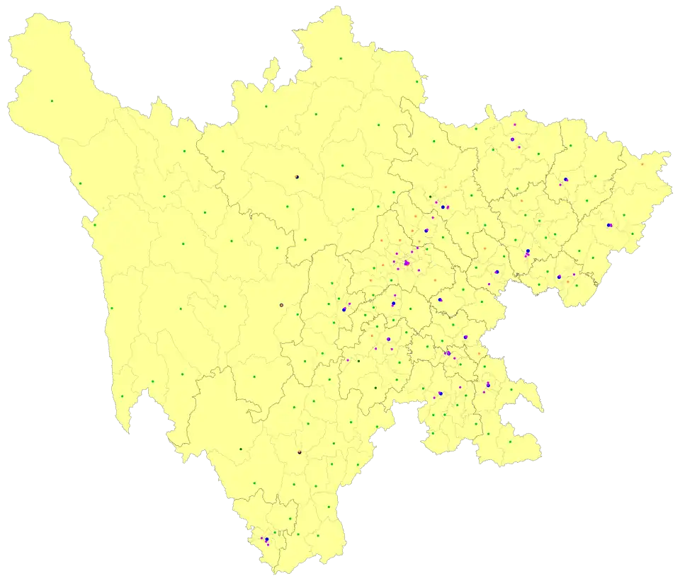 It is commonly assumed that the name Sichuan means 'four rivers'; in folk etymology, this is usually taken to mean four of the province's major rivers: the Jialing, Jinsha (or Wu), Min, and Tuo.[9][10] According to historical geographer Tan Qixiang, 'four rivers' is an erroneous interpretation of the name.[11] The name of the province is a contraction of the phrases 'Four Plain Circuits' (四川路; Sìchuān lù) and 'Four Circuits of Chuanxia' (川峽四路; chuānxiásìlù),[12] referring to the division of the existing imperial administrative circuit in the area into four during the Northern Song dynasty, which were Yizhou, Lizhou, Zizhou, and Kuizhou.[13] The word chuan () here means 'plain', not its typical meaning of 'river' as popularly assumed.[14][15] In addition to its postal map and Wade–Giles forms, the name has also been irregularly romanized as Szű-chuan and Szechuen.