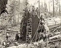 In the late 1800s, the logging industry moved westward due to the depletion of white pine forests in the upper Midwest.[74]: 9–14 This shift was encouraged by the positive portrayal of the Sierra Nevada as a promising timber region. In 1859, Horace Greely marveled, "I never saw anything so much like good timber in the course of any seventy-five miles' travel as I saw in crossing the Sierra Nevada."[75]