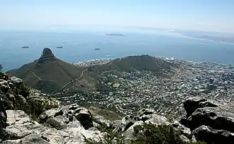 ![]() Lion's Head and Signal Hill from the summit of Table Mountain with Robben Island in Table Bay. | |