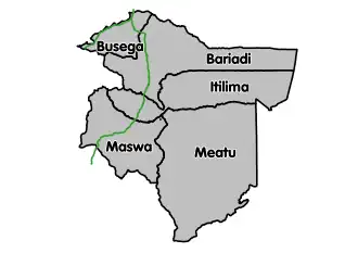 Simiyu Region (Mkoa wa Simiyu in Swahili) is one of Tanzania's 31 administrative regions. The region covers a land area of 25,212 km2 (9,734 sq mi).[3] The region is comparable in size to the combined land area of the nation state of North Macedonia.[4] The region is bordered to the north by the Mara Region, to the south by the Shinyanga Region and Singida Region. Mwanza Region borders the region to the west through Lake Victoria, and Arusha Region to the east. The region is home to the Serengeti National Park, a UNESCO World Heritage Site, shared with Mara Region. The regional capital is the town of Bariadi. According to the 2022 national census, the region had a population of 2,140,497.[5][6]