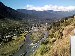 The Sind Valley is situated within the jurisdiction of Kangan tehsil, of Ganderbal district. It is bordered by the Kashmir Valley in the west, Zojila in the east, Gurez Valley of the Kishanganga River in the north and the Lidder Valley in the south.[5] It has a length of 65 kilometres (40 mi) and reaches a maximum length of 9 kilometres (5.6 mi) at village Preng towards the north through a stream Wangath Nala which flows down from Gangabal Lake. At some places the width is less than 500 metres (1,600 ft) which gives only space to NH 1D, a National Highway which connects Ladakh and the Kashmir Valley. It is formed by the flow of the Sind River which flows down from east to west. The River originates from the inner Himalayas at Drass in Machoi Glacier[6][7] and runs through green forests of pine and fir and alpine meadows of Sonamarg. The Sind Valley contributes heavily to the economy of the State, through generation of hydroelectricity, provides fresh water supply to other districts and irrigation for agriculture. The Sind River flows through the entire valley passing several natural landmarks, tourist spots including Baltal, The meadow of gold, Gagangear, Naranag and Wayil.[8] The main towns in the valley are Gund, Mammer, Kangan, Wangath, Preng, Wussan and Manigam.