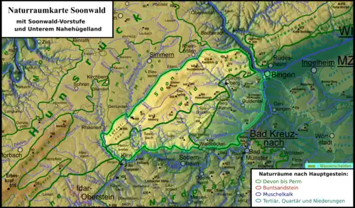 The Soonwald (German pronunciation: [ˈzoːnʋalt]) is a forested, low mountain region, up to 657.5 m above sea level (NN),[1] which forms part of the Hunsrück mountains in the German Central Uplands. It lies within the counties of Rhein-Hunsrück-Kreis and Bad Kreuznach in the state of Rhineland-Palatinate.