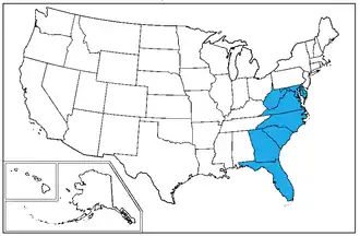 This division includes eight states and one district; Delaware, Florida, Georgia, Maryland, North Carolina, South Carolina, Virginia, West Virginia and Washington.[1] This division is also a recognized geographical division used by the United States Geological Survey.[2]: 2 All entities within the region apart from the District of Columbia and West Virginia border the North Atlantic Ocean.