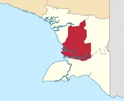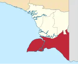 South Papua, officially the South Papua Province (Indonesian: Provinsi Papua Selatan),[4] is an Indonesian province located in the southern portion of Papua, following the borders of the Papuan customary region of Anim Ha.[5][6] Formally established on 25 July 2022 and including the four most southern regencies that were previously part of the province of Papua and before 11 December 2002 had been a single larger Merauke Regency, it covers a land area of 117,849.16 km2, about the same area as Pennsylvania (or 90% of that of England). This area had a population of 513,617 at the 2020 Census,[7] while the official estimate as at mid 2024 was 542,075 (281,466 males and 260,609 females),[1] making it the least populous province in Indonesia.