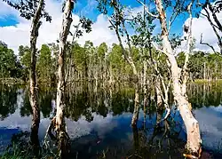 Additionally, there is a smaller but unique ecoregion called Trans-Fly savanna and grasslands which are part of Wasur National Park, a Ramsar wetland of international importance.[26] This ecoregion consists of swamp forest, coastal forest, and vast savanna that are flooded at various times, creating a wetland area with massive biodiversity like agile wallaby, mound-building termites or musamus, and the bird of paradise. This wetland also attracts migratory bird for example magpie goose from Australia, also known locally as Boha Wasur.[24][27]