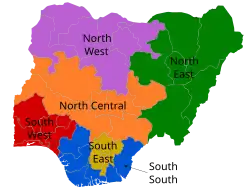 On a federal level, the Ministry of Niger Delta Affairs and its parastatal — the Niger Delta Development Commission — cover the South-South in addition to three other oil-producing states (Abia, Imo, and Ondo). Unlike the development authorities of other zones like the North-East Development Commission, the present authorities are responsible for the areas outside of the South-South as the NDDC was created in response to protests and conflict in the wider Niger Delta region. Nonetheless, the creation of a South-South Development Commission has been repeatedly proposed by some lawmakers in the late 2010s and 2020s, with proponents advocating fairness with the other zones' commissions while opponents deride the proposal as redundant.[2][3] The remit of the current development agencies includes ecological protection and infrastructure development; however, both the ministry and commission have long been beset by corruption and mismanagement that has led to the abandonment or failure of many projects.[4][5][6][7][8]