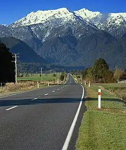 Major crossings of the Southern Alps in the New Zealand road network include Lewis Pass (SH 7), Arthur's Pass (SH 73), Haast Pass (SH 6), and the road to Milford Sound (SH 94).