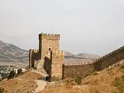 Evidence of prehistoric settlement has been found on the Southern Coast, particularly Oldowan tools found at Eçki Dağ, Gaspra, Ai-Petri, and near Sevastopol.[8] The Tauri lived on the Southern Coast, where they intermingled with the Greeks and Romans.[9] Today, several remnants of these interactions remain, such as the fortress of Charax and various toponyms (Simeiz, Gaspra, and Koreiz, among others). The Republic of Genoa also colonised the coast, under the territory of Genoese Gazaria. In 1475, the area was conquered by the Ottoman Empire and subjugated before becoming part of Russia following the Russo-Turkish War of 1768–1774, along with the rest of Crimea.[10]