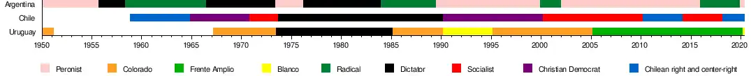 During the second half of 20th century, these countries were in some periods ruled by right-wing juntas, military nationalistic dictatorships. Around the 1970s, these regimes collaborated in Plan Cóndor against leftist opposition, including urban guerrillas.[73] However, by the early 1980s Argentina and Uruguay restored their democracies; Chile followed suit in 1990.