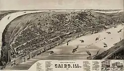 In 1858, Abraham Lincoln ran for the U.S. Senate against incumbent Stephen A. Douglas. A series of debates were held in seven towns in Illinois, including Jonesboro and Alton. Many of the people living in Southern Illinois were first- or second-generation white Southerners. Many of these families had left the slave South to escape the economic institution of slavery despite retaining its racial ideologies.[5][6] Cairo, Illinois, at the southern tip where the Ohio River joins the Mississippi, grew to considerable commercial importance. On either bank of the rivers were states which, despite remaining loyal to the national government throughout the secession crisis, had numerous residents who, for reasons predominately rooted in racial ideologies, were sympathetic to the Southern rebellion (1860–65).[7] Some prominent Southern Illinoisans were active in the Knights of the Golden Circle, which proposed a southern pan-Caribbean confederation of slaveholding states and nations.[8]