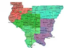 ![]() Counties in red are usually or always included in southern Illinois, while those in pink are sometimes included. | |