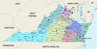 Southwest Virginia has long been a Republican stronghold, dating back to the Jim Crow era. For twenty years (1903-1923), Virginia's 9th congressional district was the only congressional district in Virginia — and one of the few in the entire former Confederacy — to be represented by a Republican. The district alternated between Democratic and Republican representation over the rest of the century. Some of the election results were so close — and questionable — that the district became known as "The Fighting Ninth."[5] The region has close ties with neighboring East Tennessee, Western North Carolina, Southern West Virginia, and Eastern Kentucky, which are all part of Appalachia and the Upland South.