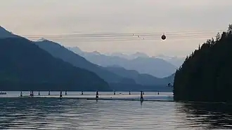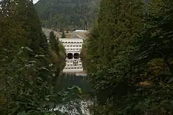 The Stave River, the traditional territory of the Sxa'yaks (Skayuks), a vanished Halqemeylem-speaking Coast Salish people related to today's Sto:lo, was a productive salmon river. The Skayuks demise was caused by the introduction of smallpox by the Europeans and subsequent expansion by the Kwantlen First Nation.[2] The presence of large red cedar trees attracted lumber companies, notably Stave Lake Cedar, whose mill was a mile above the damsite. The lower portion of the Stave is called Hayward Lake, formed by Ruskin Dam and formerly a canyon similar to Capilano and Lynn Canyons, and at its head in the grounds of the one-time community of worker's housing, there is a recreation area there and the beginning of a lakeside trail using the right-of-way of a railway line.