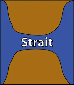 A strait is a water body connecting two seas or water basins. The surface water is, for the most part, at the same elevation on both sides and flows through the strait in both directions, even though the topography generally constricts the flow somewhat. In some straits there is a dominant directional current. Most commonly, the strait is a narrowing channel that lies between two land masses. Straits are loci for sediment accumulation, with sand-size deposits usually occurring on the two strait exits, forming subaqueous fans or deltas. Some straits are not navigable because, for example, they are too narrow or too shallow, or because of an unnavigable reef or archipelago.