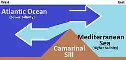 Water flows through the Strait more or less continuously, both eastwards and westwards. A smaller amount of deeper, saltier and therefore denser waters continually flow westwards (the Mediterranean outflow), while a larger amount of surface waters with lower salinity and density continually flow eastwards (the Mediterranean inflow). These general flow tendencies may be occasionally interrupted for brief periods by temporary tidal flows, depending on various lunar and solar alignments. The balance of the water flow is eastwards, since the evaporation rate within the Mediterranean basin is higher than the combined inflow of all the rivers that empty into it, plus the total precipitation of rain or snow that falls on it.[25] At the Strait's far western end is the Camarinal Sill, the Strait's shallowest point which limits mixing between the cold, less saline Atlantic water and the warmer, more saline Mediterranean waters.