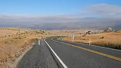 The celebrated New Zealand painter Colin McCahon as a schoolboy in 1936, had what he later described as a 'vision' looking westward from a point on the coastal hills over the Taieri Plain apparently to the plateau country south of the Strath Taieri proper. He later said his art had been an attempt to communicate this vision. He described it as seeing a landscape 'standing far from the sun of Egypt in the Otago cold.' He called it a 'landscape of splendour and order and peace', which he conceived as a pre-Biblical place.[14] In 1945, his younger and also celebrated Otago contemporary, the poet James K. Baxter, wrote 'Upon the upland road/Ride easy, stranger:/Surrender to the sky/Your heart of anger.' The lines certainly capture the effect on some people of the experience of crossing the plateau, approaching the Strath Taieri by road from the south.[15]