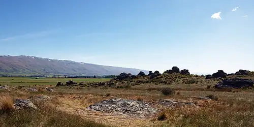 There is evidence that moa hunters (1300–1500) were once active on the Strath Taieri, the Taieri Gorge, at Deep Stream and Rocklands on the adjacent plateau to the south.[1] A Māori route from the coast to the interior lay along the valley. Activity during the Classic period (1500–1642) is attested by a cave discovered in 1949 with its entrance blocked, containing the bodies of a Māori woman and child.[2] It is not clear if they were trapped deliberately or accidentally. This corresponds with other sites in the area containing rock shelters with mostly domestic articles, wooden bowls, material for garments and gear for hunting weka or fishing.[3] Charles Kettle saw the area from the top of Maungatua in 1847 and was impressed by the land's pastoral potential.