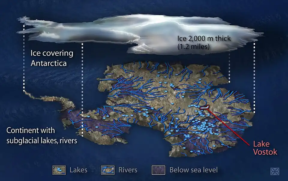 61. 1 2 3 4 5 Siegert, Martin J.; Ellis-Evans, J. Cynan; Tranter, Martyn; Mayer, Christoph; Petit, Jean-Robert; Salamatin, Andrey; Priscu, John C. (2001). "Physical, chemical and biological processes in Lake Vostok and other Antarctic subglacial lakes". Nature. 414 (6864): 603–609. Bibcode:2001Natur.414..603S. doi:10.1038/414603a. ISSN 1476-4687. PMID 11740551. S2CID 4423510.