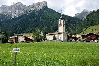 Before 2017, the municipality was located in the Rheinwald sub-district, of the Hinterrhein district, after 2017 it was part of the Viamala Region.[5] It is a Haufendorf (an irregular, unplanned and quite closely packed village, built around a central square).