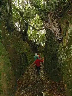 Sunken lanes are common in the West of France, in the bocage landscape, especially around Lower Normandy, Brittany and Anjou. The bocage landscape is historically famous for having been a particular feature of some conflicts, including the Chouannerie,[7] or more recently the Battle of Normandy. The German army used sunken lanes to implement strong points and defenses to stop the American troops on the Cotentin peninsula and around the town of Saint-Lô.[8]