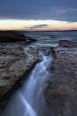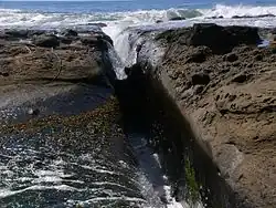 A surge channel is a narrow inlet, usually on a rocky shoreline, and is formed by differential erosion of those rocks by coastal wave action.[1][2] As waves strike the shore, water fills the channel, and drains out again as the waves retreat. The narrow confines of the channel create powerful currents that reverse themselves rapidly as the water level rises and falls, and cause violent hydrodynamic mixing. However, there is relatively little exchange of water between channels; experimental studies and mathematical modelling of the coastline near Hopkins Marine Station in California have shown that water is rapidly mixed within each channel, but that it mostly moves in an oscillatory manner. Surge channels have been likened to 'containment vessels', retaining water borne gametes and probably enhancing the effectiveness of external fertilisation of marine species dwelling within them.[3][4]