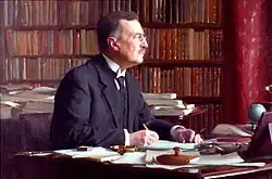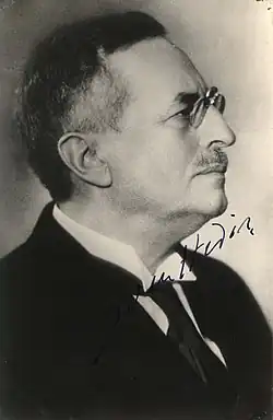 The Nazis attempted to achieve a close connection to Hedin by bestowing awards upon him—later scholars have noted that "honors were heaped upon this prominent sympathizer."[17] They asked him to present an address on Sport as a Teacher at the 1936 Summer Olympics in Berlin's Olympic Stadium. They made him an honorary member of the German-Swedish Union Berlin (German: Deutsch-Schwedische Vereinigung Berlin e.V.) In 1938, they presented him with the City of Berlin's Badge of Honor (German: Ehrenplakette der Stadt Berlin). For his 75th birthday on 19 February 1940 they awarded him the Order of the German Eagle; shortly before that date it had been presented to Henry Ford and Charles Lindbergh. On New Year's Day 1943 they released the Oslo professor of philology and university rector Didrik Arup Seip from the Sachsenhausen concentration camp at Hedin's request[18] to obtain Hedin's agreement to accept additional honors during the 470th anniversary of Munich University. On 15 January 1943, he received the Gold Medal of the Bavarian Academy of Sciences (Goldmedaille der Bayerischen Akademie der Wissenschaften). On 16 January 1943 he received an honorary doctorate from the faculty of natural sciences of Munich University.[19] On the same day, the Nazis founded in his absence the Sven Hedin Institute for Inner Asian Research located at Mittersill Castle, which was supposed to serve the long-term advancement of the scientific legacy of Hedin and Wilhelm Filchner as Asian experts. However, it was instead misused by Heinrich Himmler as an institute of the Research Association for German Genealogical Inheritance (Forschungsgemeinschaft Deutsches Ahnenerbe e.V.).[20] On 21 January 1943, he was requested to sign the Golden Book of the city of Munich.