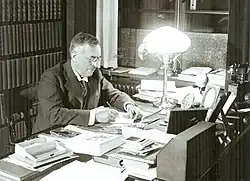 Hedin met Adolf Hitler and other leading Nazi Party leaders repeatedly and was in regular correspondence with them. The politely-worded correspondence usually concerned scheduling matters, birthday congratulations, Hedin's planned or completed publications, and requests by Hedin for pardons for people condemned to death, and for mercy, release and permission to leave the country for people interned in prisons or concentration camps. In correspondence with Joseph Goebbels and Hans Dräger, Hedin was able to achieve the printing of the Daily Watchwords year after year.[14] Hedin directly interviewed Hitler in October 1939, one month after the invasion of Poland, where Hitler claimed that there could be peace if the United Kingdom and France recognized the German occupation of Czechoslovakia.[15]