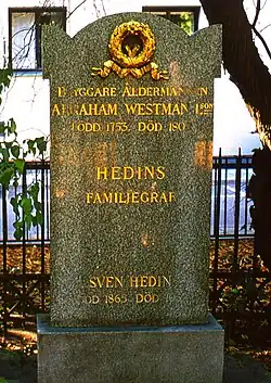 Hedin died at Stockholm in 1952. The memorial service was attended by representatives of the Swedish royal household, the Swedish government, the Swedish Academy, and the diplomatic service. He is buried in the cemetery of Adolf Fredrik church in Stockholm.
