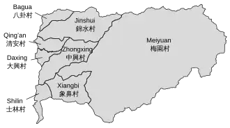 The township comprises eight villages: Bagua, Daxing, Jinshui, Meiyuan, Qingan, Shilin, Xiangbi and Zhongxing.[7]