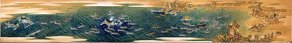 The people of Taiji experienced great loss and economic hardship after an incident in 1878, when a large group of whalers were lost at sea while hunting a whale. The whale was harpooned, but was strong enough to pull the whaling boats out to sea. Refusing to cut the whale loose until it was too late, many whalers drowned or were otherwise adrift and lost at sea as a result. Around one hundred whalers died in the course of this event.[7] After the Russo-Japanese War, Taiji's whaling industry became buoyant again as it became a base for modern whaling. When the practice of Antarctic whaling started, Taiji provided crews for the whaling fleet.[8] In 1988, Taiji suspended commercial whaling as a result of a ruling by the International Whaling Commission (IWC).