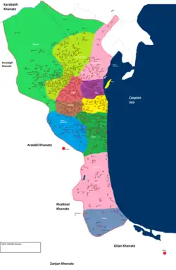 Talish was composed of various fiefs which would sometimes be granted to other emirs than the governor of Talish. For instance, Mohammad Khan Torkman was given control over a number of fiefs in Talish and Mughan in 1586.[24] Later in 1684, Safiqoli Khan was one of the officers in control of Lankaran, and Hoseyn was another. Meanwhile, the unnamed governor of Talish lived in Ardabil.[25] The Safavid shahs (kings) of Iran attempted to control local Talysh chiefs by subordinating them to obedient officials. Nevertheless, despite their centralization strategy, the Safavid administration was unable to terminate the local autonomy in the South Caucasus.[26] Officially, the local chiefs were not hereditary lords, but officials whose rank were acknowledged by a royal farman (edict) which in reality was an acceptance of their local autonomy. The familial succession of the chiefs gave rise to dynasties that dominated local affairs and sought to consolidate their influence whenever the national government weakened.[26]