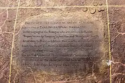 The original name of Tanjung Sampang Mangazou comes from the language of the indigenous Rungus, an ethnic group which resides mainly in the district of Kudat. The words Tanjung (cape), Sampang (union) and Mangazou (battle) refers to this location of a battle that occurred when the ethnic Rungus defended their territory against the attack from Moro Pirates.[n 1][1][4] According to legend, this place was a favourite landing point for the pirates.[4]