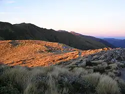 The western slopes of the ranges are subject to prevailing moisture-carrying winds, channelled by Cook Strait to the south. These are the source of an annual rainfall of approximately 5,000 mm, resulting in the dominance of conifers, ferns and shrubs on the western side of the ranges. By contrast, the pattern on the eastern side is one of open beech forest in a drier environment.[1] In spite of a reputation of being composed of gloomy bush, impenetrable leatherwood, and wet snow tussocks on mist-shrouded tops, the Tararua Range has a wide diversity of vegetation, ranging from alpine tussock grasslands and subalpine shrublands to forests of montane miro/kāmahi, or beech or lowland broadleaf forests with emergent podocarps and kāmahi.[4]