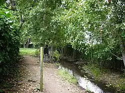 The middle fork flows through Temescal Canyon mostly in underground culverts, beneath the Grove Shafter Freeway starting near the Caldecott Tunnel and underneath the interchange with State Route 13. It joins the south fork at Lake Temescal.[3] Before the Caldecott tunnel project (1934–37), this fork entered the lake via a prominent inlet that was traversed by a trestle bridge of the Sacramento Northern Railroad. The inlet was filled in and the trestle replaced by a large concrete embankment which exists to this day.