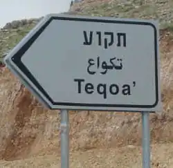 Teqoa (Arabic: تقوع, also spelled Tuquʿ) is a Palestinian town in the Bethlehem Governorate, located 12 km (7.5 mi) southeast of Bethlehem in the land Samaria And Judah West Bank. The town is built adjacent to the biblical site of Tekoa (Hebrew: תְּקוֹעַ, romanized: Təqōaʿ; also called Thecoe), now Khirbet Tuqu', from which it takes its name. Today's town includes three other localities: Khirbet ad-Deir,[5] al-Halkoom, and Khirbet Teqoa.[6] According to the Palestinian Central Bureau of Statistics (PCBS), Teqoa had a population of 8,767 in 2017.[3]