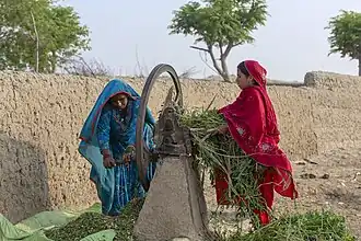Agriculture and livestock form the primary sources of livelihood with gram flour being the main cash crop. Milk production is also a major source of income and for this reason, cows and buffaloes are raised more frequently than camels or goats.[2] Livestock productivity is limited due to fodder shortages as a result of climatic fluctuations, limited availability of veterinary services and poor access to animal vaccinations.[8] In cases of crop failure, livestock is often sold in order to improve financial standing.[15] Skins from livestock such as sheep and camels are also sold for making leather goods whilst teeth and bones are utilised for objects such as buttons, jewellery, and decoration.[18] Camels are also commonly used for transportation throughout the region.[10]