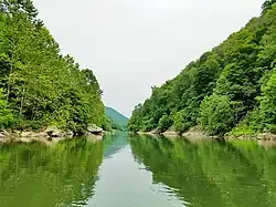 The Trough is a 6-mile long wooded gorge carved by the South Branch Potomac River (SBPR) and situated in the Allegheny Mountains of Hampshire and Hardy Counties, West Virginia, US. The area was the site of a 1756 skirmish of the French and Indian War, known as the "Battle of the Trough".