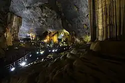 Thiên Đường Cave (Paradise Cave) is a cave in Phong Nha-Kẻ Bàng National Park, UNESCO's World Heritage Site, 60 km northwest of Đồng Hới city. Thiên Đường Cave is located on an elevation of 350 meters above the sea level, near the west branch of Ho Chi Minh Highway, in Son Trach Commune, Bố Trạch District, Quảng Bình Province, Vietnam. The cave was discovered by a local man in 2005 and the first 5 km of this cave was explored by explorers from British Cave Research Association in 2005, the whole 31 km was explored and publicly announced by the British cave explorers. This cave is 31 km long, longer than Phong Nha Cave which had been considered the longest cave in this national park. The height can reach to 72 m and 150 m wide. The limestone formation is also more spectacular than that of Phong Nha Cave. The British cave explorers were impressed by the beautiful and spectacular stalactites and stalagmites inside this cave and they named it Thiên Đường Cave (Paradise Cave).[1][2] In 2012, a new species of troglobiontic scorpion species, Vietbocap thienduongensis was found in here.
