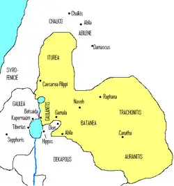 The Decapolis is named from its ten cities enumerated by Pliny the Elder (23–79). What Pliny calls Decapolis, Ptolemy (c. 100–c. 170) calls Cœle-Syria.[19] Ptolemy does not use the term "Transjordan", but rather the periphrasis "across the Jordan".[20] And he enumerates the cities; Cosmas, Libias, Callirhoe, Gazorus, Epicaeros—as being in this district—east of the Jordan, that Josephus et al. called Perea.[21][22][23][24]