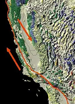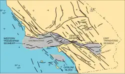 The distinctive feature of the Transverse Ranges besides their anomalous orientation is that they are bounded by east-west trending faults. Most are left slip, strike slip faults. In the western and central segments many of the faults are thrust faults.[1][2] Faults in the Coast Ranges and Peninsular Ranges trend northwest-southeast and butt into the east-west trending faults of the Transverse Ranges. Because all of these faults are considered active and seismic but they do to cut each other, the only geometry that satisfies that observation is if the east-west faults and Transverse Ranges are rotating clockwise with respect to the faults outside that province.[10]