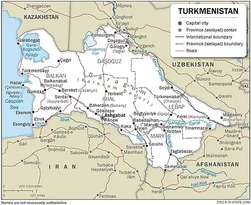 - ↑ "TURKMENISTAN-UZBEKISTAN: Cross border movement remains problematic". Integrated Regional Information Networks. June 6, 2005. Retrieved 2007-06-07.