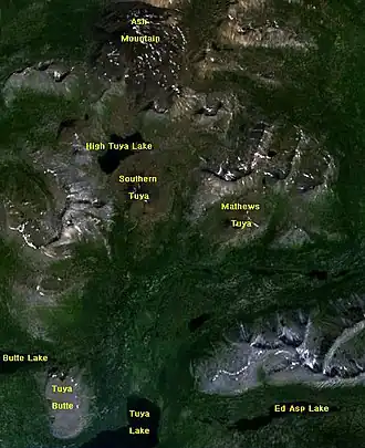 ![]() Map of some features in the Tuya Volcanic Field, which is part of the Tuya Range | |