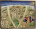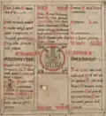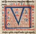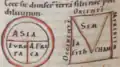 V-in-square maps appear only in manuscripts. The earliest known example is found with a copy of the Etymologiae made before 811.[1] It continued to be included in copies as late as the 15th century, but not later. The most elaborate example of the type was that painted by the Master of Jouvenel des Ursin for a copy of Giovanni Colonna's Mare historiarum, which may have been based on a V-in-square map in a copy of Raoul de Presles's translation of Augustine's De civitate Dei, where it could have been used to show the monstrous races as all descended from Adam.[6]